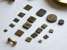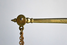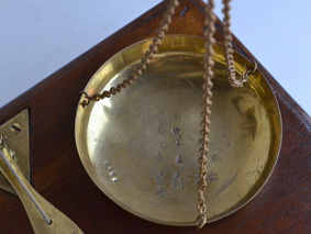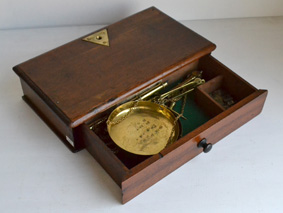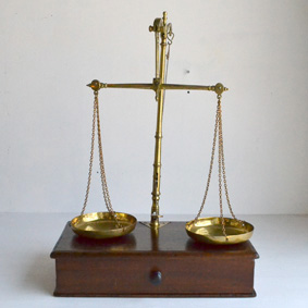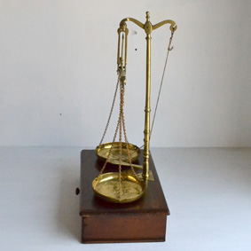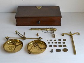 天秤の素材は真鍮、ベースはマホガニー、18個の錘が付属しています。