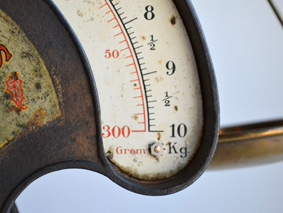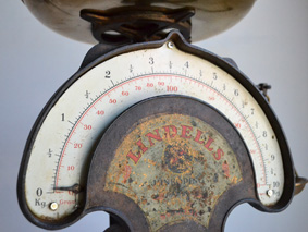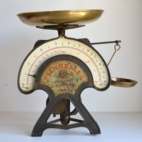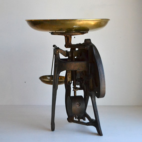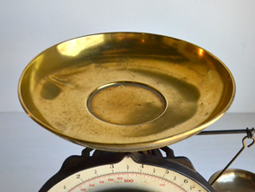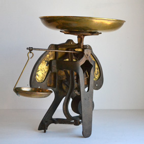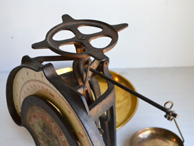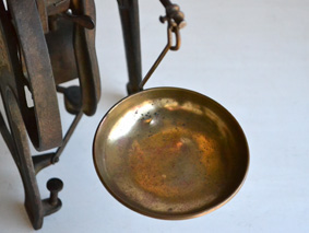 真鍮製の皿が2枚、上部の皿で 10 kg まで、向かって左に下げられた小さな皿で 300 g までの物を測ります。