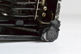 タイプライターにはキズ、脚に取り付けられたゴムの劣化、箱には革のハゲがあります。